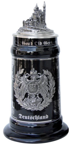 This Bavarian castles beer stein has a hand painted raised-relief decoration with 24K Gold accents. The body features six Bavarian castles: Neuschwanstein with a swan motif, Linderhof, Nymphenburg, Schachen, Hohenschwangau and Herrenchiemsee. Bavarian crest with lions and crowns adorn the bottom rim. Relief conical pewter lid and thumb lift.