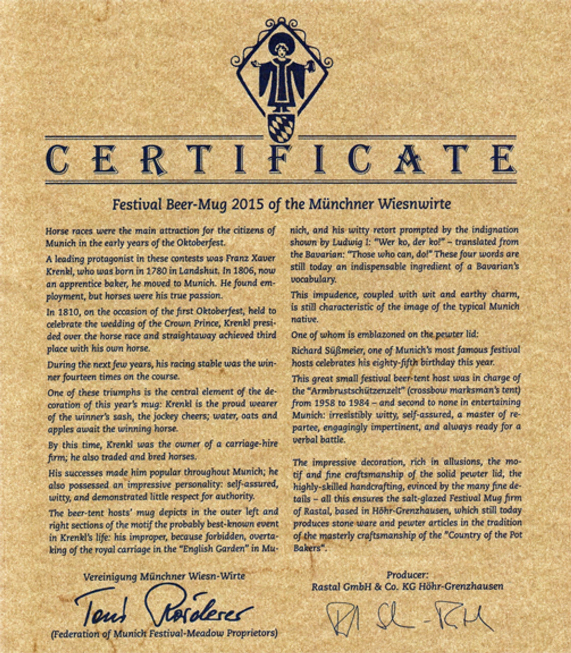 The sides also feature the logos of all the beer tents at the 2015 Oktoberfest depicted in a border of grape leaves.  The antique finish pewter lid is embossed with Wiesnwirt and innkeeper “Richard Süssmeier”, who appears dressed as Napoleon to pay tribute to his nick-name “Wirte-Napoleon”.